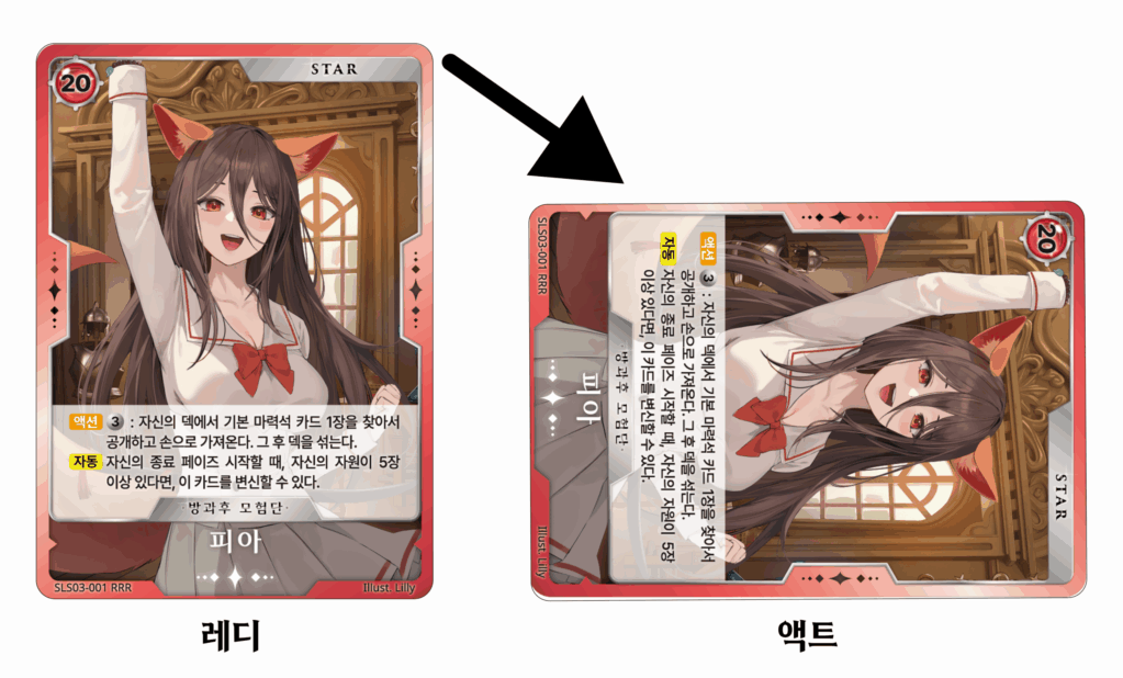 스타 카드의 액션 능력을 사용하거나 캐릭터 카드의 공격, 전장과 자원에 있는 카드의 액션 능력 사용, 자원 카드를 사용하여 라이트로 비용을 지불하는 경우에 「액트」상태가 됩니다.