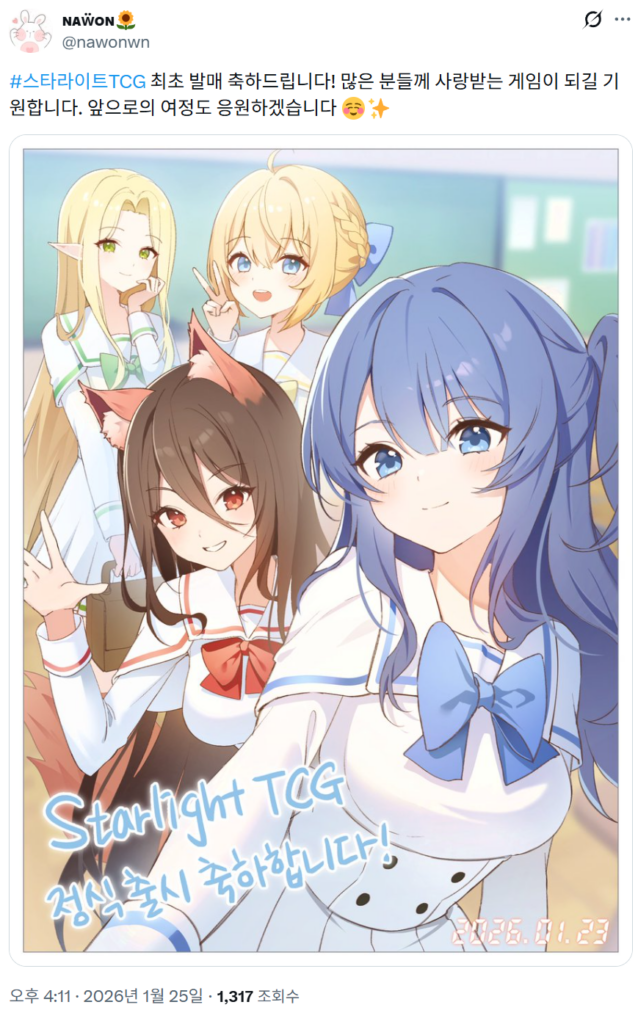 별빛 공인 매장 대부분이 주말 후 재주문에 들어갔으며, 일부 매장은 싱글 카드도 취급하시기 시작했습니다. 이는 모두 <스타라이트TCG>를 사랑해주시고 즐겁게 플레이해주신 플레이어 여러분의 덕택입니다. 저희 별빛 내부 구성원 뿐 아니라 <스타라이트TCG>에 일러스트레이션으로 참여해주시는 작가님도 특전을 통해 <스타라이트TCG>의 출시를 축하해주셨습니다.