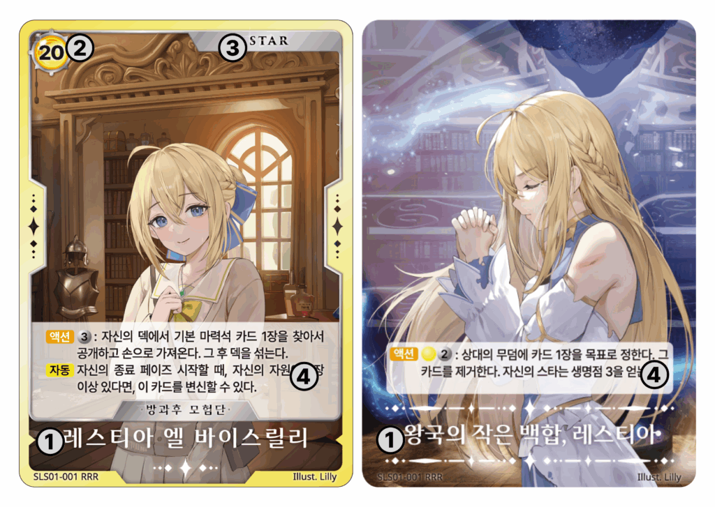 스타 카드는 여러분의 파트너로 게임 시작과 함께 합니다. 처음에는 생명점 표기가 있는 면으로 시작하며, 조건이 완성되면 변신합니다.